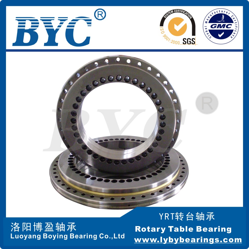 BRT(YRT)转台轴承 由一个推力/向心座圈,一个推力/向心轴圈,一个推力垫圈,两个滚针保持架组件和一组向心圆柱滚子组成。座圈和轴圈有均布的安装用螺钉孔。该型轴承具有高轴向和径向承载能力。高倾斜刚度和极高的精度。适用于回转工作台,卡盘和铁刀头以及测量和实验中的轴承配置。该型轴承对与之相配的设备零件的要求也较高。安装时需控制安装螺钉的扭紧力矩。